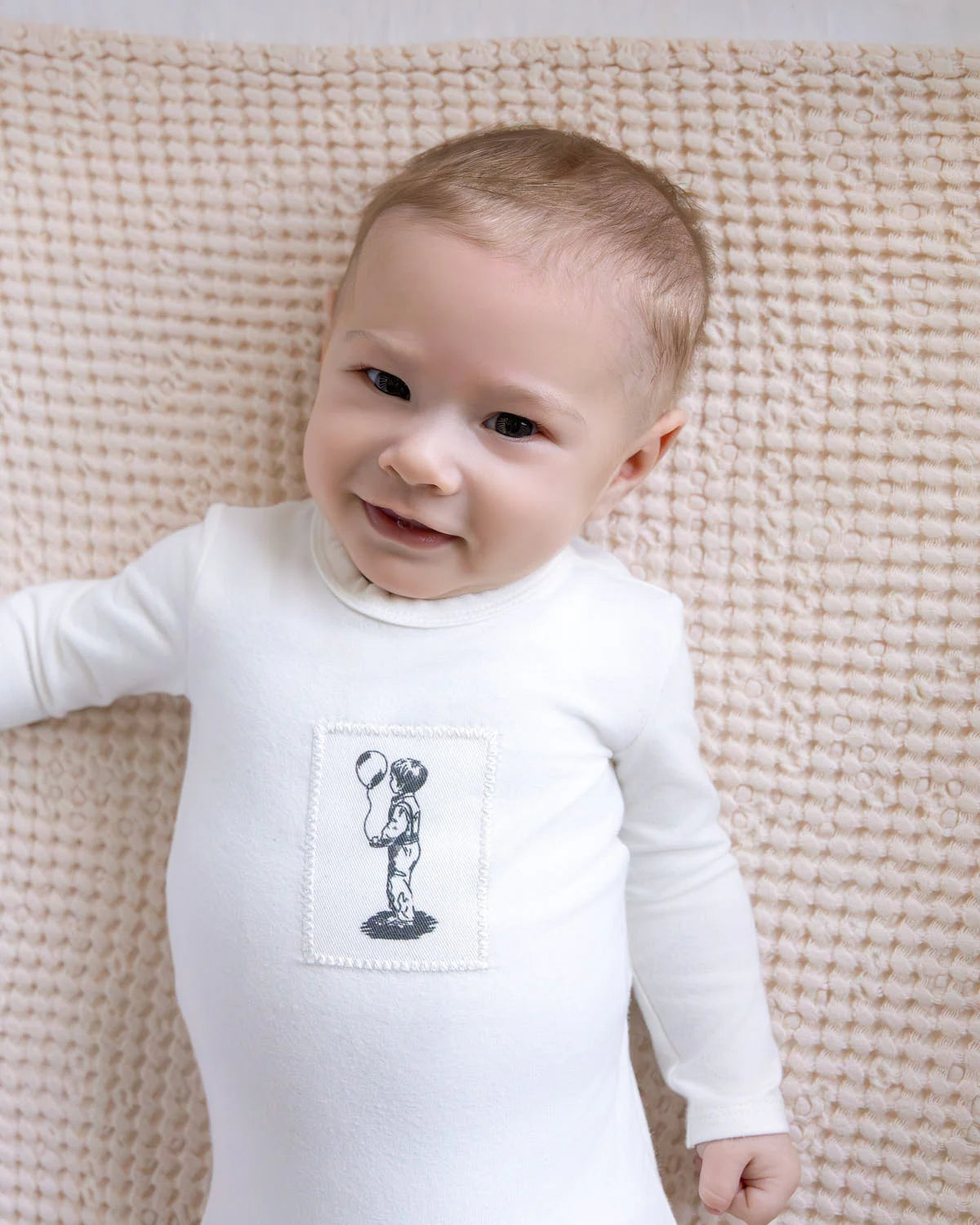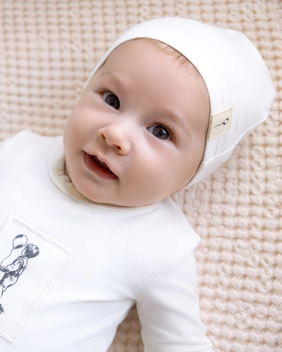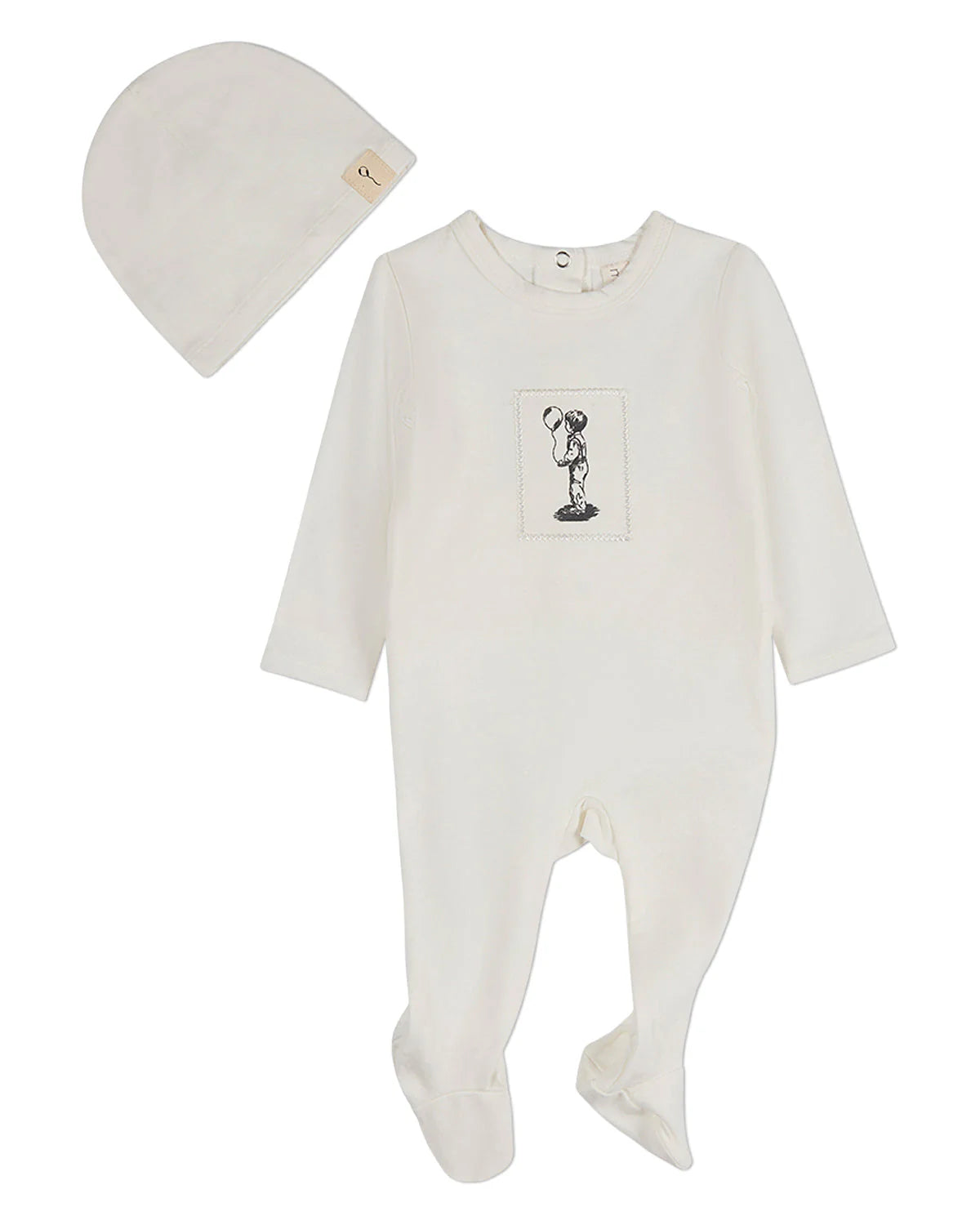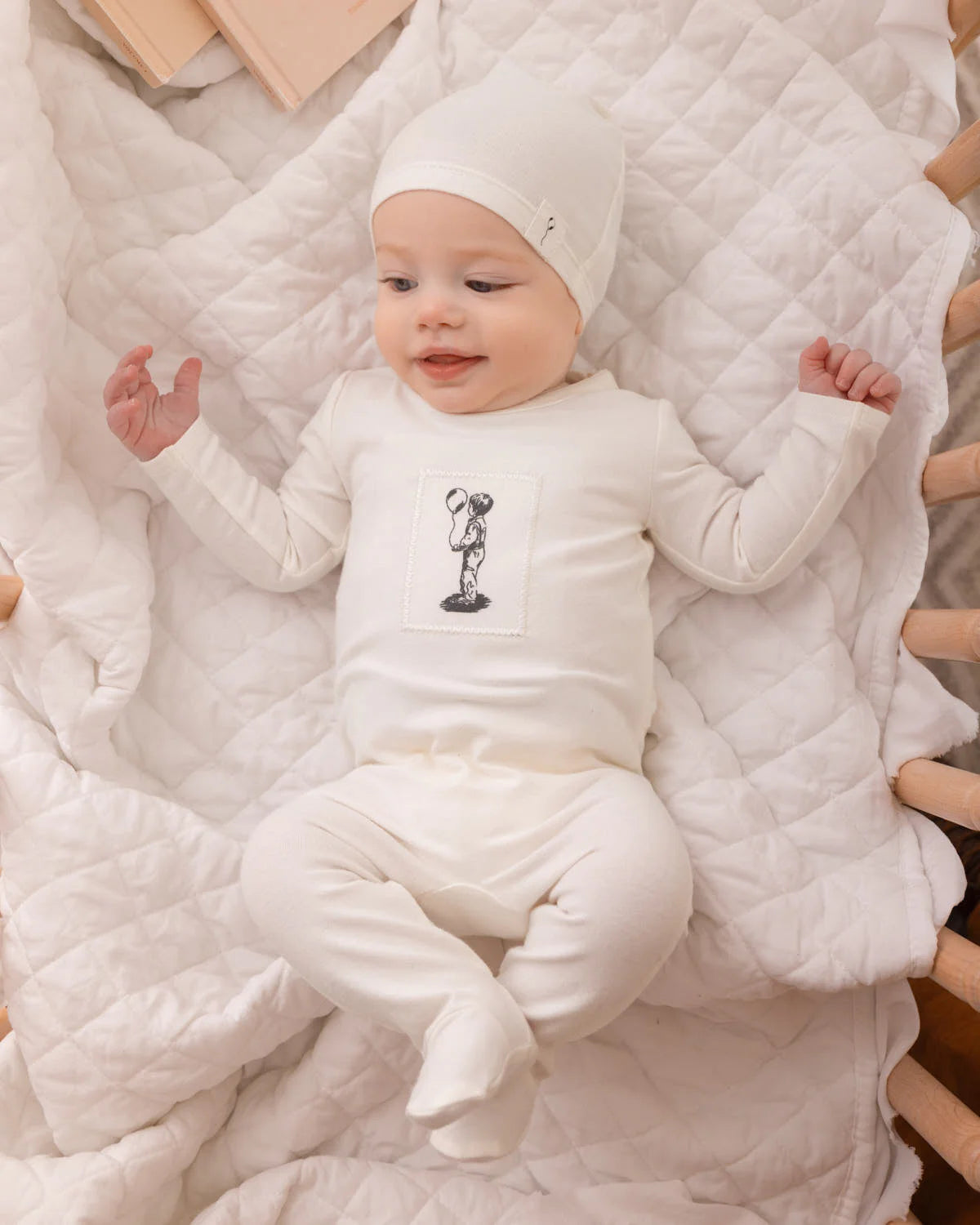 Keep him cozy from head to toe in our vintage-inspired footie set. It comes in our premium blend: 95% breathable cotton for blissful, buttery softness plus 5% flexible spandex for sleek stretch and shape-keeping fit. Both the head-warming beanie and the cute long-sleeve footie feature charming retro graphics.
