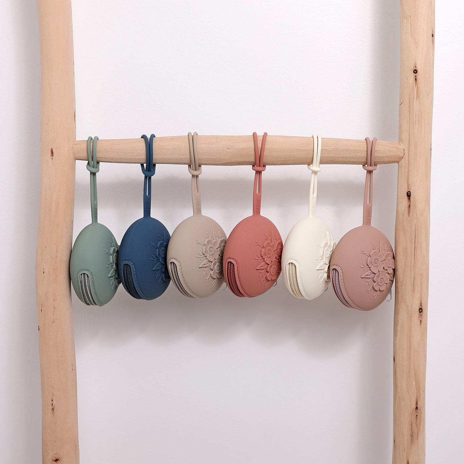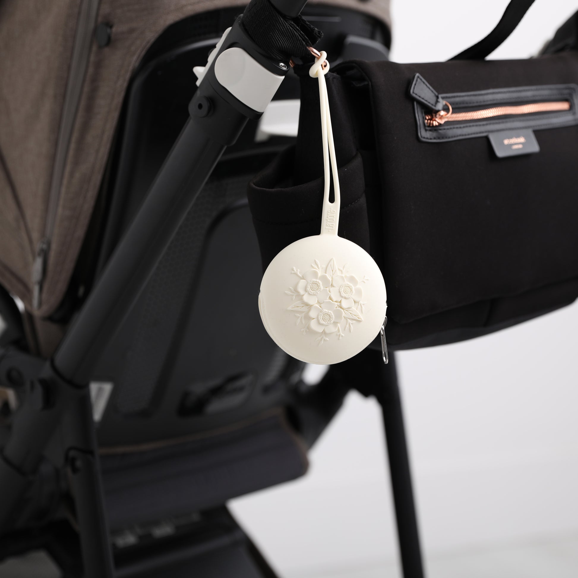 This pacifier case has a strong strap and can hold up to three pacifiers. Attach it to a diaper bag or stroller for convenient access. It's made of food-grade silicone in classic colors and can be cleaned in the dishwasher.